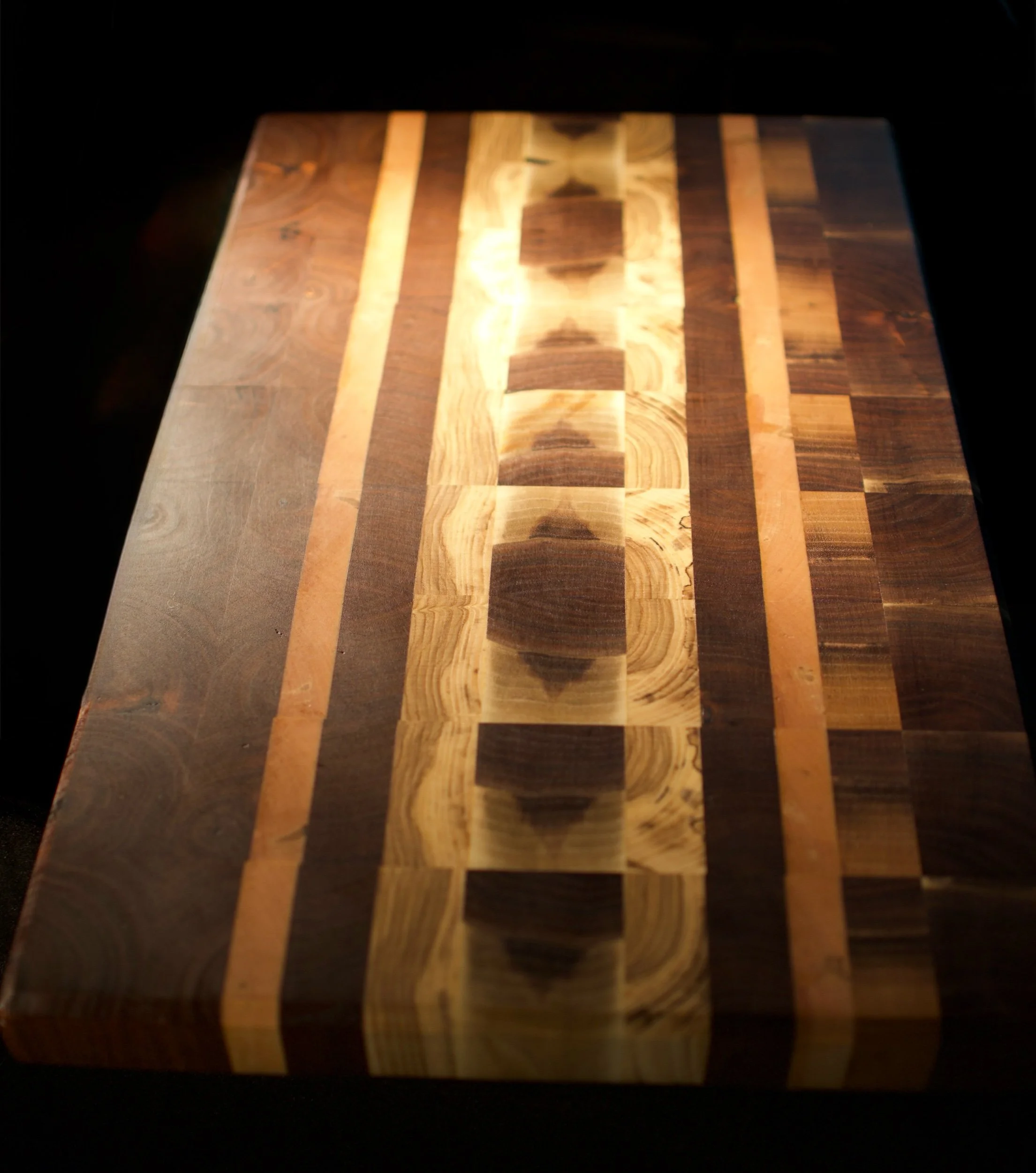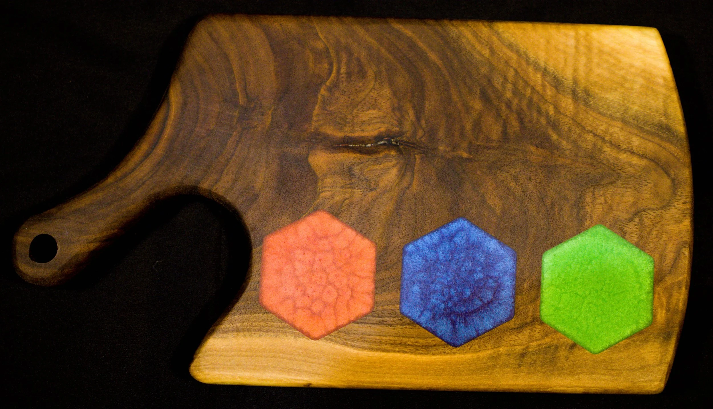 Cheese Board Hex Inlay $65.00 Walnut C-Table $400.00 End Grain Cutting Board $220.00 Bread Cutting Bow Knife $45.00 Charcuterie Board $75.00 Viking Camp Chair $115.00